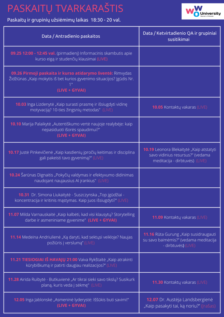 Paskaitos ir kiti užsiėmimai vyks antradieniais ir kelis ketvirtadienius 18:30 – 20 val. per Zoom. Įrašus galėsi peržiūrėti savo laiku patogioje mokymosi platformoje.